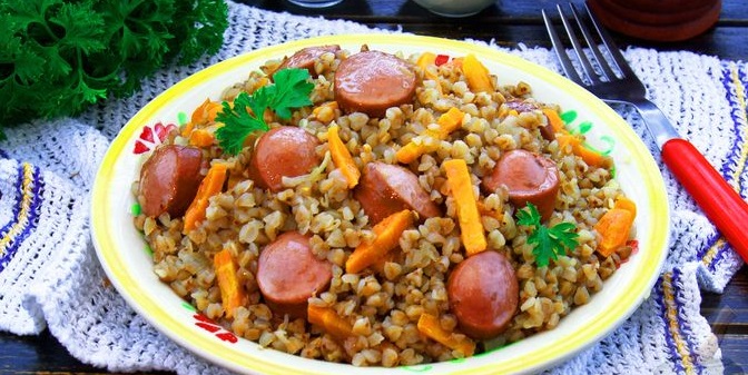 Гречка з сосисками на сковороді