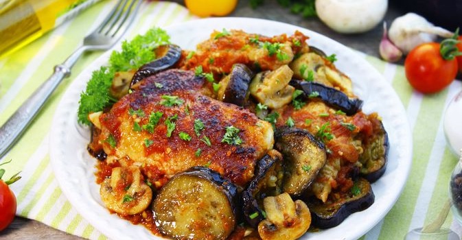 Курка, запечена з баклажанами та грибами в томатному соусі