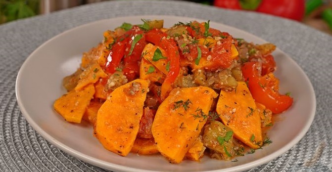 Також нарізаємо батат. Всипаємо до решти інгредієнтів та перемішуємо. Рагу солимо та перчимо за смаком. Додаємо улюблені спеції. Перемішуємо та доводимо страву до готовності. Смачного!