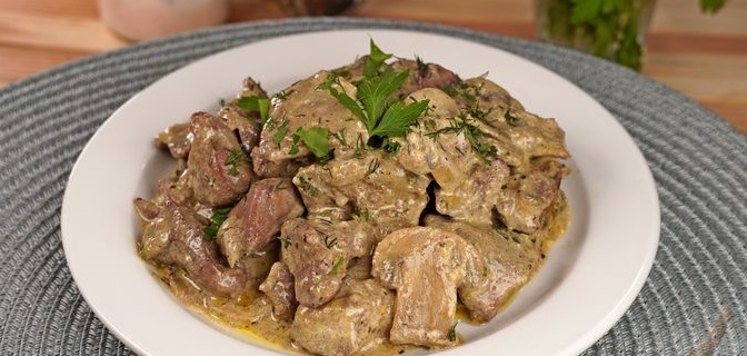 Куряча печінка, тушкована з грибами у сметанно-гірчичному соусі
