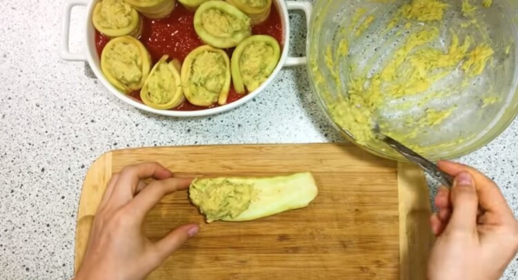 На кожну смужку баклажанів викладаємо фарш, звертаємо рулет і ставимо його в форму. Так звертаємо всі баклажани.
