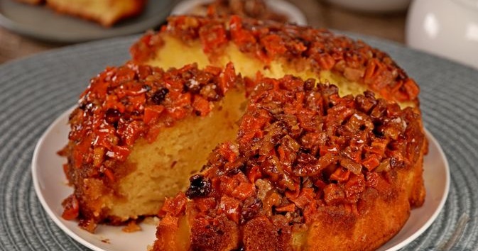 Тісто відправляємо на морквяну начинку та відразу ставимо в духовку. Пиріг випікаємо 45 хвилин при температурі 180 градусів. Потім його перевертаємо та подаємо до столу. Смачного!