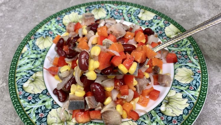 Додаємо консервовану квасолю з кукурудзою, висипаємо сушений орегано, щіпку чорного меленого пперцю, додаємо нерафіновану рослинну олію, ретельно все перемішуємо і подаємо.
