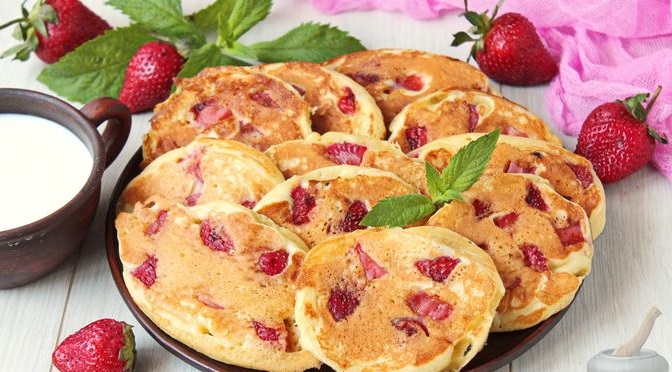 Оладки з полуницею виходять настільки смачними й ароматними, що вмить зникають з тарілки. Вони прості у приготуванні. Такі оладки можна подавати на сніданок з будь-якими напоями.