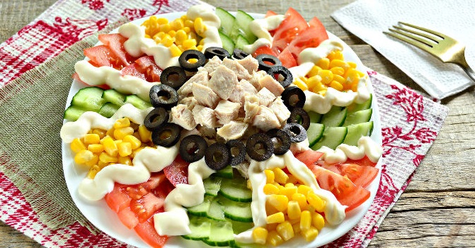 Помідори та огірки промиваємо та обсушуємо. Потім нарізаємо півкільцями. Овочі викладаємо на плоску тарілку секторами. Копчене куряче філе нарізаємо кубиками. Викладаємо його у центрі тарілки. Вільні місця заповнюємо консервованою кукурудзою.