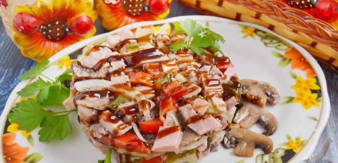 Для приготування салату за цим рецептом знадобиться небагато інгредієнтів. Страва виходить дуже смачною та ситною. М’ясний салат з грибами часто подають до святкового столу. Він точно сподобається Вашим гостям.