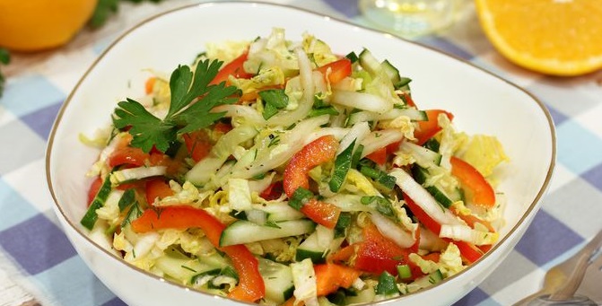 Пекінську капусту нарізаємо тоненькими смужками. Викладаємо в миску. Потім подрібнюємо огірки, болгарський перець та зелену цибулю. Додаємо до решти інгредієнтів та перемішуємо. Дрібно нарізаємо кріп та петрушку. Теж відправляємо в миску та перемішуємо.