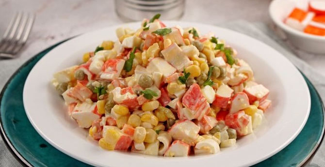 Салат з крабовими паличками, зеленим горошком та кукурудзою