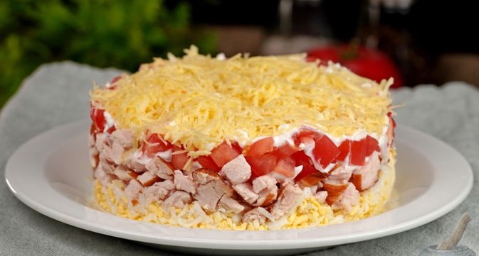 Салат з копченою куркою, помідорами та сиром