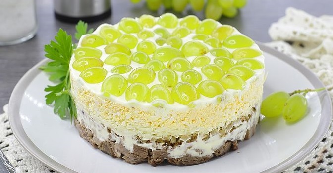 Яловичину відварюємо до готовності та нарізаємо кубиками. Подрібнюємо грецькі горіхи, а сир натираємо на тертці. Також натираємо відварені яйця. Виноград розрізаємо навпіл. Першим шаром викладаємо м’ясо. Солимо та перчимо. Потім змащуємо майонезом.