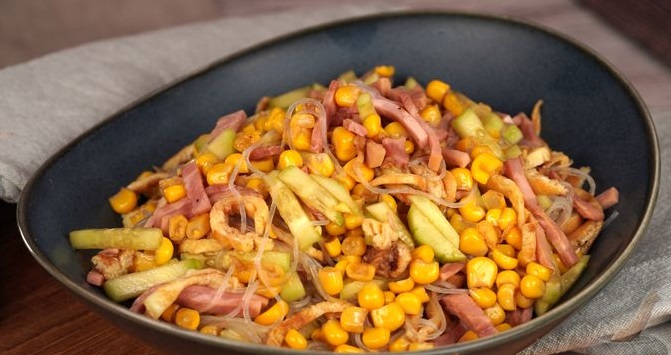 Такий салат дуже простий у приготуванні. Він складається з бюджетних інгредієнтів та виходить мегасмачним. Салат з фунчозою, млинцями, шинкою та овочами точно сподобається Вашим гостям.