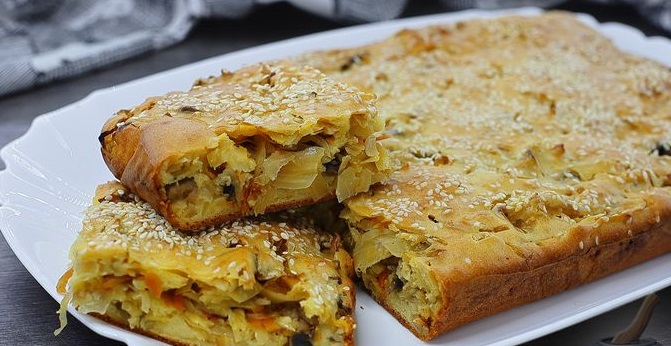 Потім формуємо шар з начинки та знову поливаємо тістом. За бажанням посипаємо кунжутом та ставимо в духовку. Заливний пиріг випікаємо 50 хвилин при температурі 180 градусів. Трохи охолоджуємо та подаємо до столу. Смачного!