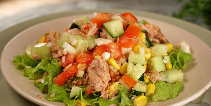 Салат з тунцем, кукурудзою, овочами та яйцем