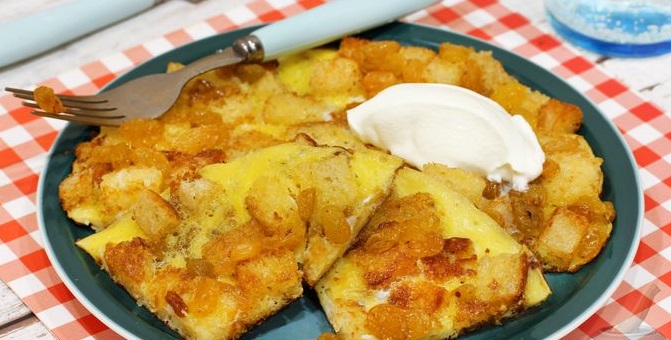 Страва готується дуже швидко та просто. Найчастіше її подають на сніданок. Яєчня з грінками та родзинками виходить ніжною на смак та дуже апетитною. Вона бюджетна та ситна.