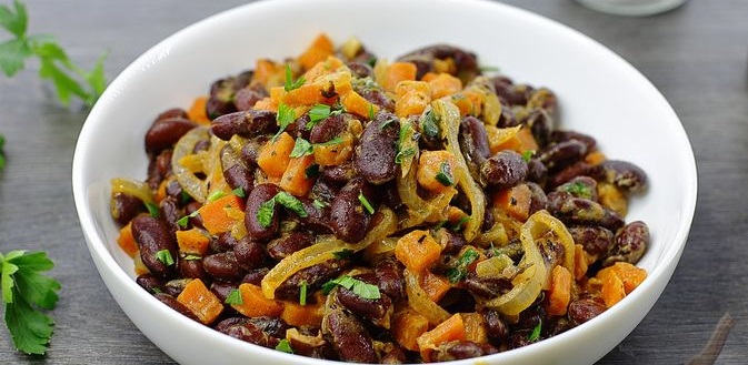 Квасолю замочуємо у воді на декілька хвилин. Потім варимо її до м’якості й трохи охолоджуємо. Моркву нарізаємо кубиками, а цибулю півкільцями. Овочі викладаємо на розігріту сковорідку та смажимо декілька хвилин.