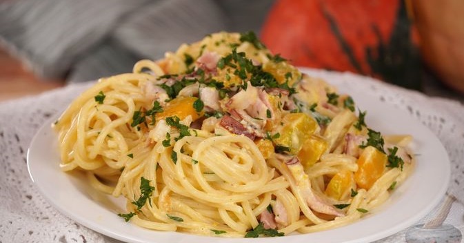 Спагеті чудово смакуватимуть на вечерю. За цим рецептом вони виходять ароматними, ситними та дуже апетитними. Спагеті з беконом та гарбузом у вершковому соусі сподобаються всій Вашій сім’ї.