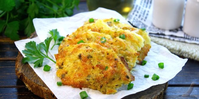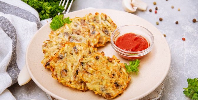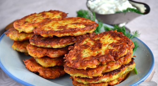 Картопляні деруни з сиром, зеленою цибулею та часником