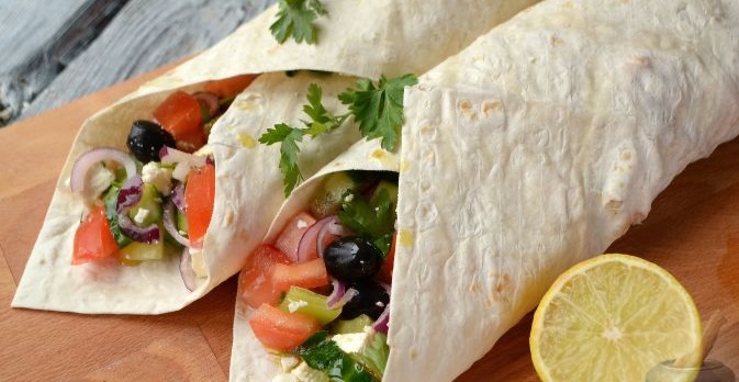 Вкінці салат заправляємо оливковою олією та все перемішуємо. Акуратно викладаємо його на лаваш та загортаємо. Грецький салат в лаваші відразу подаємо до столу. Смачного!
