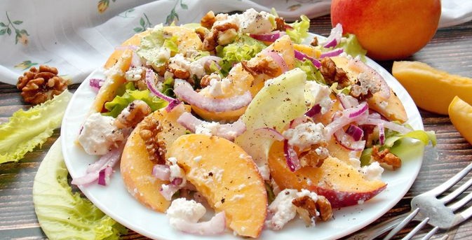 Такий салат виходить настільки апетитним, що відразу зникає з тарілки. Він дуже смачний та ситний. Салат з персиками, фетою та волоськими горіхами точно сподобається Вашим рідним.