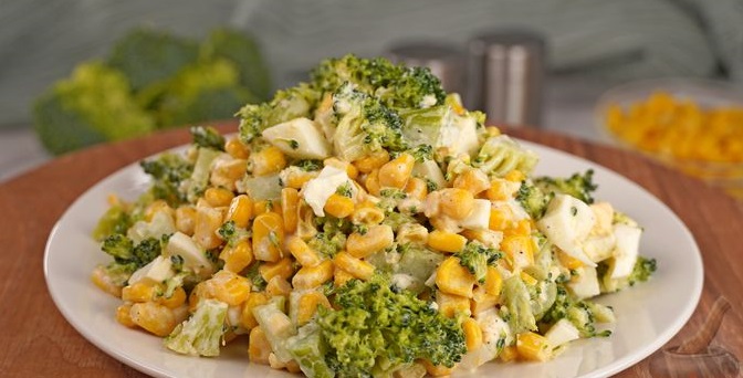 В миску викладаємо яйця та броколі. Потім всипаємо консервовану кукурудзу й додаємо часник. Солимо та перчимо за смаком. Салат заправляємо майонезом та ретельно перемішуємо. Потім подаємо його до столу. Смачного!