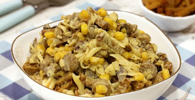 Салат з печерицями, сиром, кукурудзою та сухариками