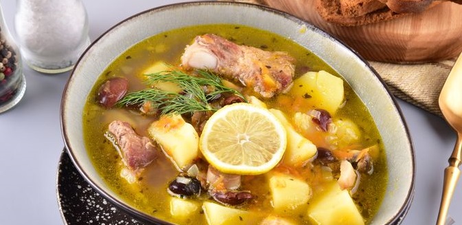 Засмажку готуємо ще декілька хвилин та відправляємо до супу. Також всипаємо квасолю. Сіль та спеції додаємо за смаком. Суп варимо до готовності. Перед подачею прикрашаємо шматочком лимона. Смачного!
