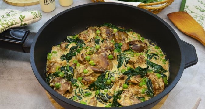 Куряча печінка, тушкована у вершках із зеленим горошком та шпинатом