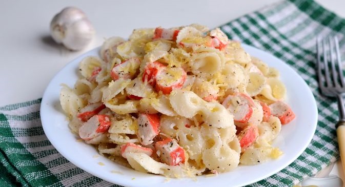 Макарони з крабовими паличками, сметаною та часником