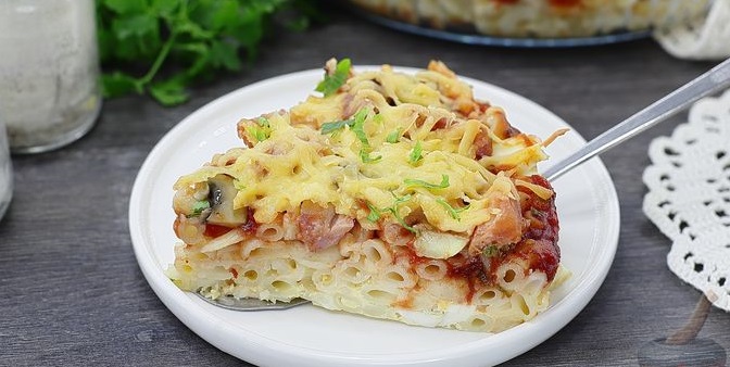 Піца з макаронів з шинкою, грибами та сиром