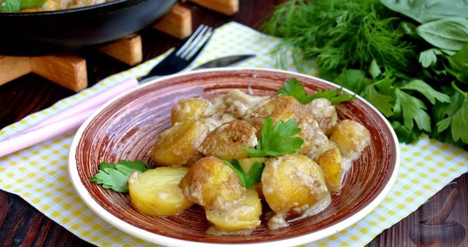 Для приготування страви знадобляться прості інгредієнти та небагато часу. Така картопля виходить дуже ніжною на смак, адже готується у молочно-грибному соусі. Страва ситна та апетитна на вигляд.