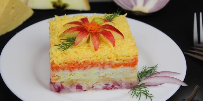 Багатошаровий салат з яблуками, морквою, сиром та яйцями