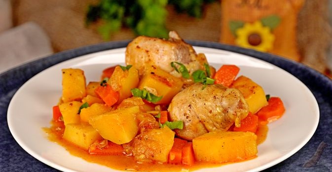 Курячі ніжки, тушковані з овочами в апельсиновому соусі