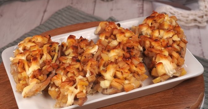 Куряче філе нарізаємо на однакові шматочки. Відбиваємо їх, а потім солимо та перчимо. М’ясо викладаємо у форму, застелену пергаментом. Зверху кладемо готову начинку з цибулі та айви. Потім робимо сіточку зі сметани. Запікаємо все в духовці 35 хвилин при температурі 180 градусів. Смачного!
