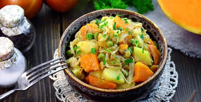 Овочеве рагу з гарбузом, капустою та зеленим горошком