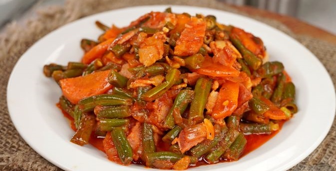 На вигляд страва дуже смачна та апетитна. Тушкована стручкова квасоля з беконом виходить нереально ситною. Завдяки томатному соусу страва має ніжний смак. Обов’язково приготуйте її на вечерю.