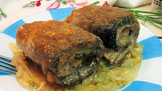 Запечений оселедець у гірчичному соусі зі смаженою цибулею
