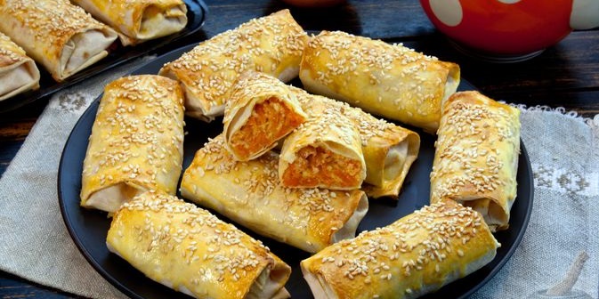 Лаваш нарізаємо на однакові шматочки. Викладаємо морквяну начинку та загортаємо в рулетики. Деко застеляємо пергаментом та змащуємо вершковим маслом. Викладаємо туди рулетики. Зверху їх змащуємо яєчним жовтком та посипаємо кунжутом. Випікаємо в духовці 15 хвилин при температурі 200 градусів. Смачного!
