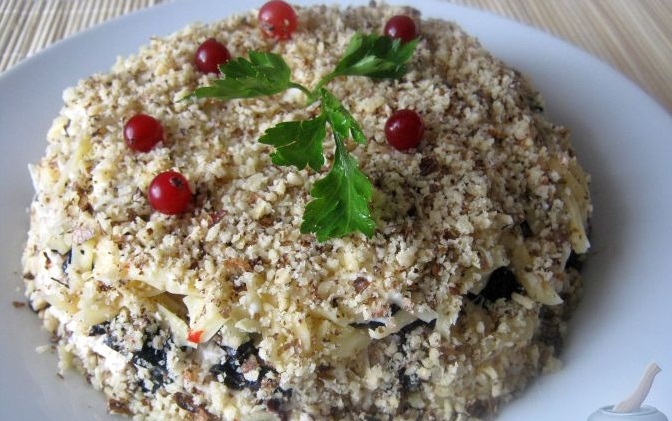 Зверху посипаємо тертим сиром. Змащуємо майонезом. Весь салат посипаємо подрібненими горіхами. За бажанням прикрашаємо зеленню та відразу подаємо до столу. Смачного!