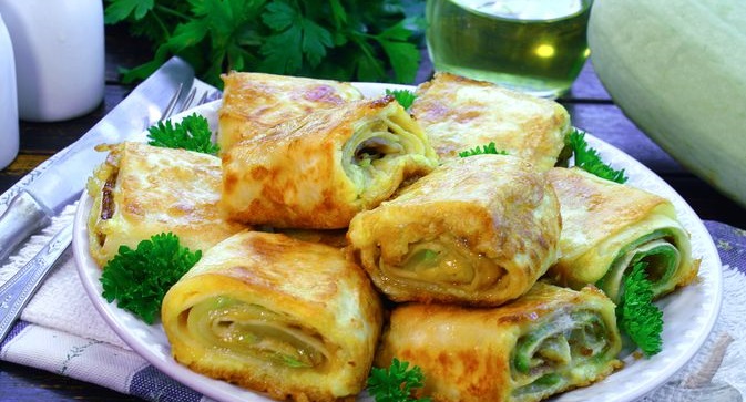 Загортаємо все в рулет та нарізаємо на шматочки. Обвалюємо їх у збовтаних яйцях та відправляємо на розігріту сковорідку. Рулетики смажимо до золотистої скоринки з двох боків. Смачного!