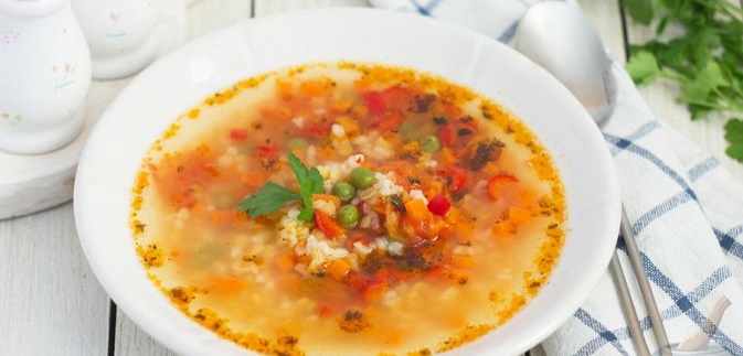Овочевий суп із сочевицею, зеленим горошком та рисом