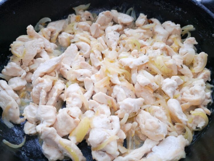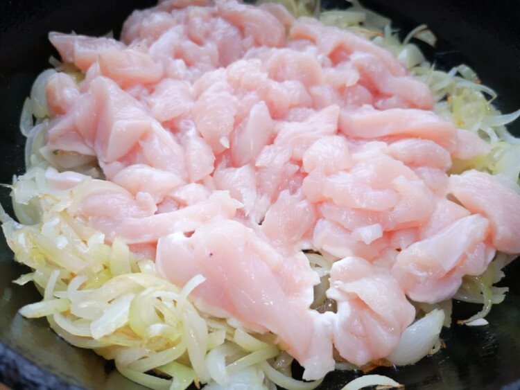 На сковороду налийте трохи олії для смаження і підрум’яньте цибулю, потім додайте шматочки м’яса. Перемішайте і тушкуйте під кришкою хвилин 5-7 хвилин, не забувайте перемішувати курочку.