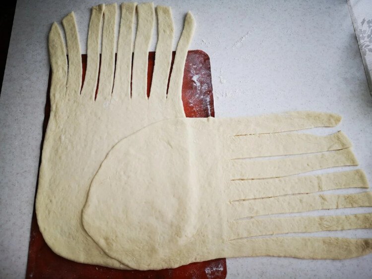 Розрізаємо половину пласта на смужки шириною 1, 5-2 см. (Смужки можна робити і ширші, від їх ширини буде залежати кінцевий результат плетіння)