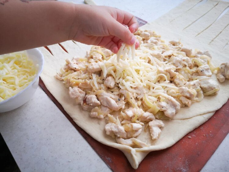 Всю начинку викладаємо в центр тіста, надаючи форму квадрата.