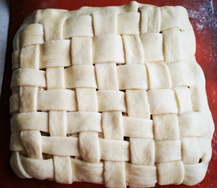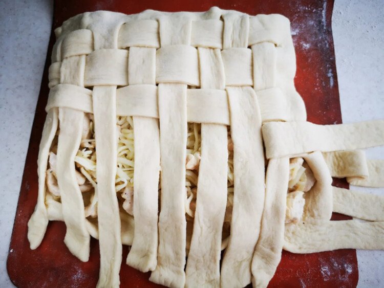 Кінці смужок ховаємо під основу тіста. Отримані краї трохи защіплюємо, щоб не витекла начинка. Але при цьому не псуйте зовнішній вигляд пирога.
