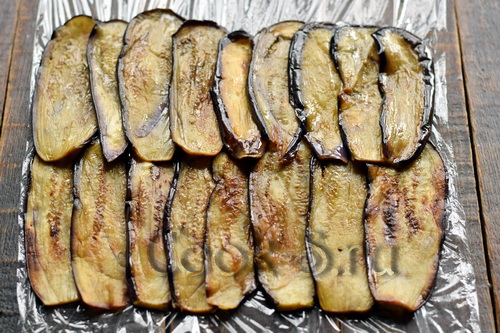 Баклажани нарізаємо тонкими пластинами. Солимо й залишаємо на 10-15 хвилин. Потім накриваємо серветкою і сильно віджимаємо долонями. Це робиться для того, щоб баклажани стали пластичними і добре згорталися в рулет. Зверху злегка змащуємо олією за допомогою пензлика і відправляємо в гарячу духовку.