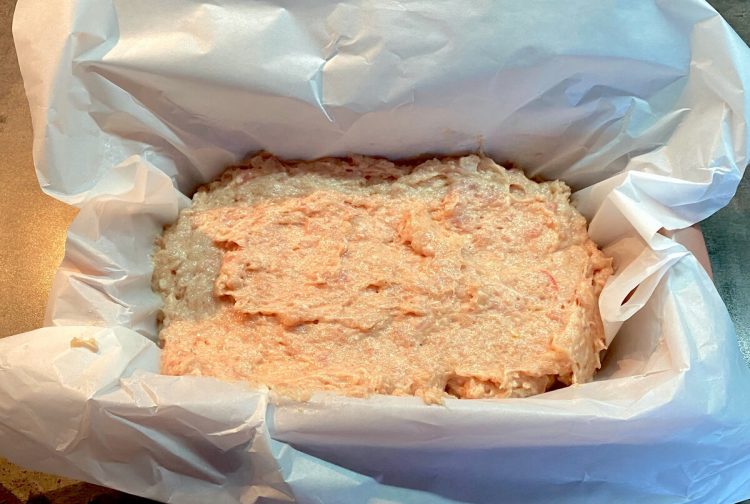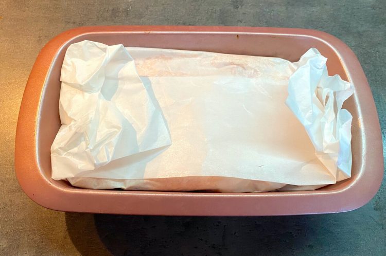 Форму застеляємо пергаментом так, як показано на фото. Потім виклдаємо в неї м’ясний фарш та добре його розрівнюємо.