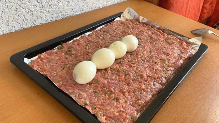 7. На лист покладіть лист фольги і викладайте на нього фарш, рівномірно розподіляючи по всій поверхні. По центру покладіть варені яйця (цілком). У нас виходить шість штук на один рулет.