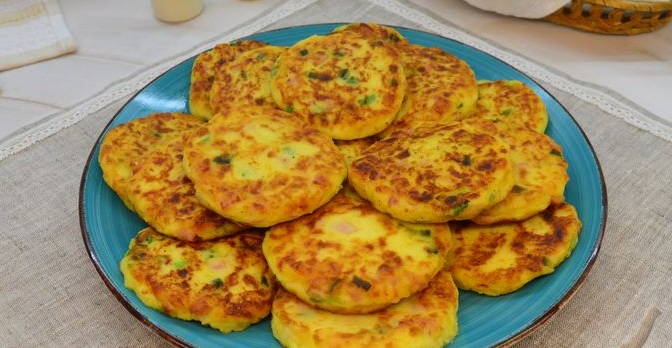Відварену картоплю перетворюємо на пюре. Додаємо борошно й тертий сир. Потім всипаємо нарізану шинку та цибулю. Вбиваємо яйця. Сіль та спеції додаємо за смаком. Все ретельно перемішуємо.