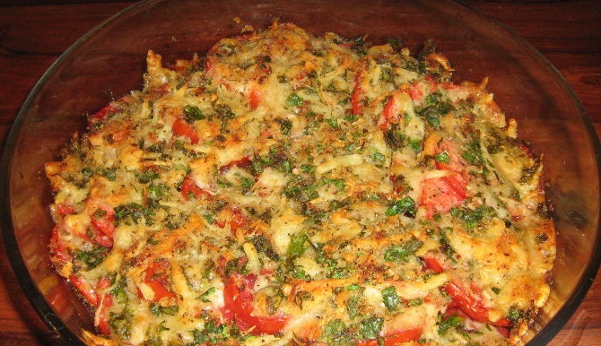 Сиром та зеленню посипаємо помідори. Відразу відправляємо їх в духовку. Помідори запікаємо 30 хвилин при температурі 200 градусів. До столу їх подаємо гарячими. Смачного!