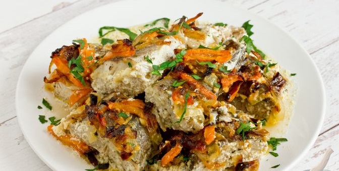 Минтай, запечений з овочами у сметанно-гірчичному соусі